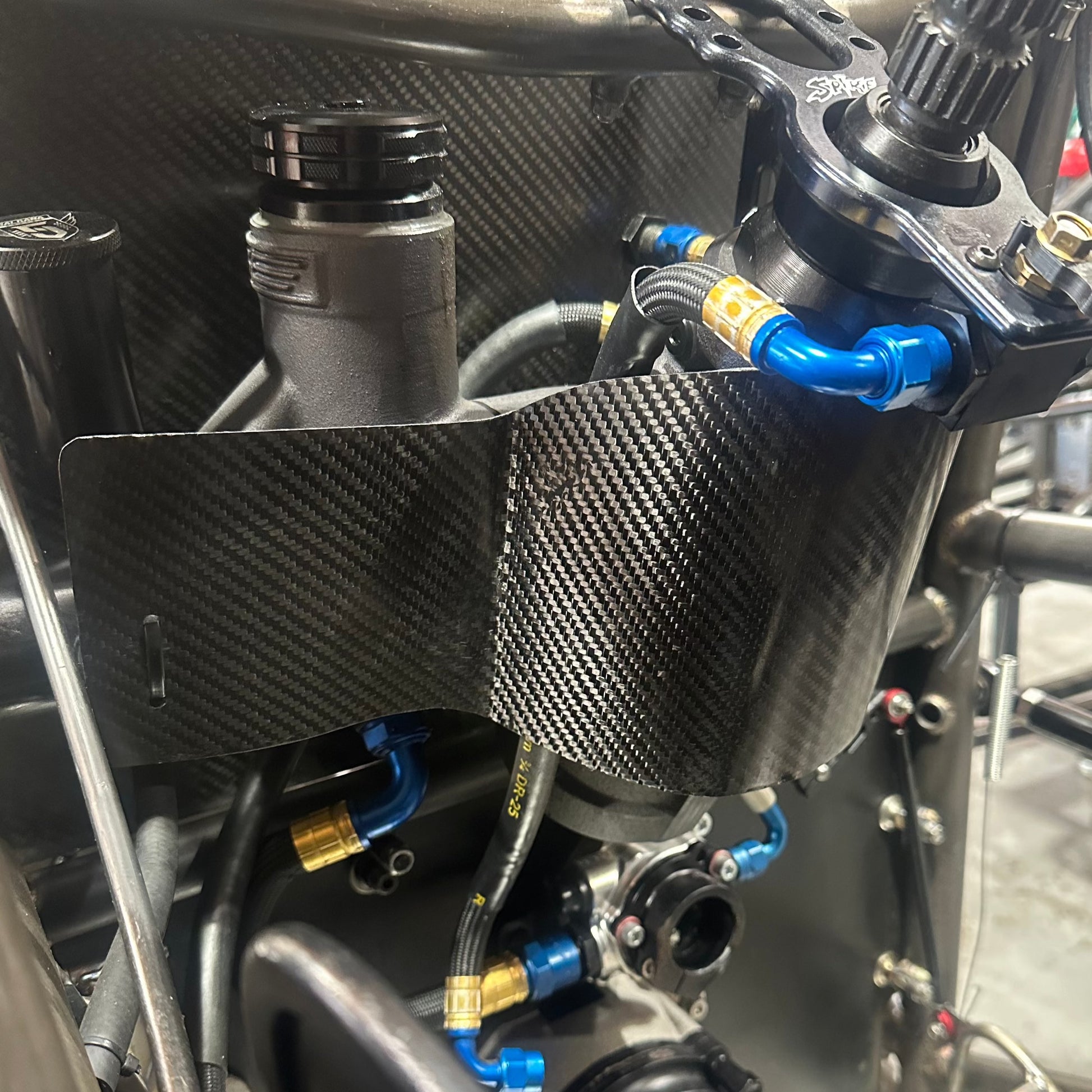 Protect your driver's knees with this 100% autoclave cured prepreg carbon fiber knee guard. Designed to wrap tightly around a KSE Gen2 steering box.